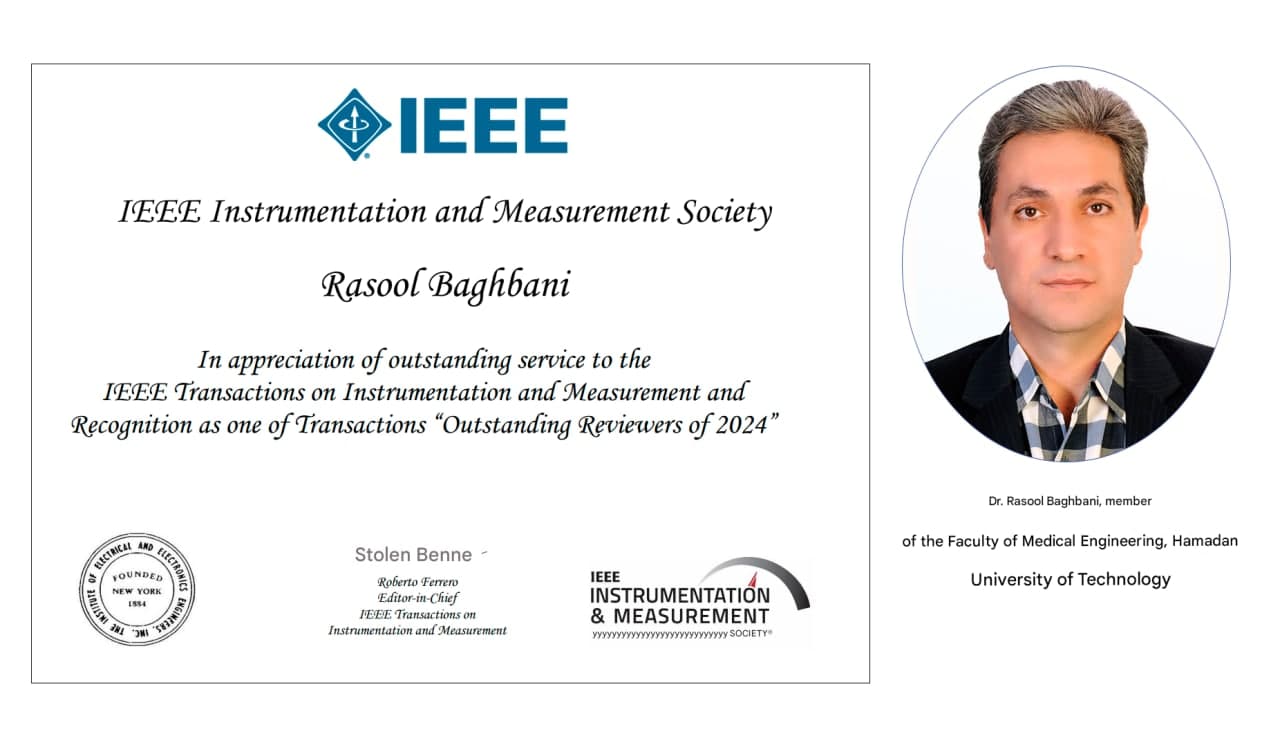 Dr. Rasoul Baghbani, faculty member of the Biomedical Engineering Department, was recognized as an Outstanding Reviewer by the Editor-in-Chief and Editorial Board of the IEEE Transactions on Instrumentation and Measurement (TIM) journal and the Publications Committee of the Instrumentation and Measurement Society (IMS).