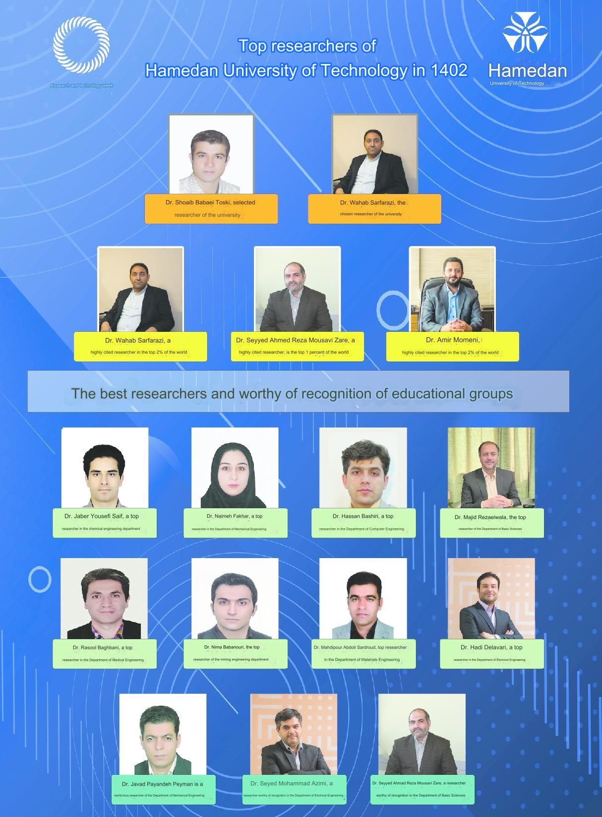 Outstanding researchers at Hamedan University of Technology were introduced and appreciated. Among them, Wahab Sarfarazi, a member of the Mining Engineering faculty, and Shaib Babaei Touski, a member of the Electrical Engineering faculty, were recognized as outstanding provincial researchers.