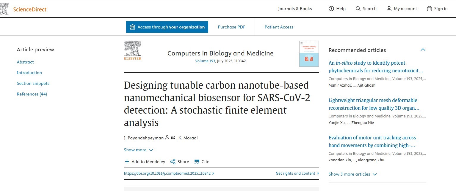 The article, titled "Designing Tunable Carbon Nanotube-Based Nanomechanical Biosensor for SARS-CoV-2 Detection: A Stochastic Finite Element Analysis," showcases Dr. Payandeh Peyman’s innovative contributions to biosensor technology for viral detection. The full article is available online at: ScienceDirect.